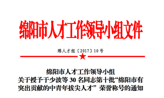 7月5日,綿陽市委、市政府批準授予我公司董事長于少波第十批“綿陽市有突出貢獻的中青年拔尖人才”榮譽稱號。該稱號的授予,充分肯定了于董在加快科技城建設和推進綿陽經(jīng)濟社會事業(yè)發(fā)展中所做出的突出貢獻。