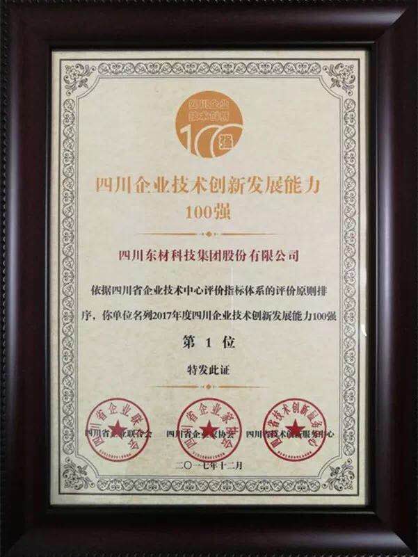 12月8日,2017四川100強(qiáng)企業(yè)發(fā)布會(huì)在成都舉行。四川東材科技集團(tuán)股份有限公司在企業(yè)技術(shù)創(chuàng)新發(fā)展能力100 強(qiáng)中位列第一。