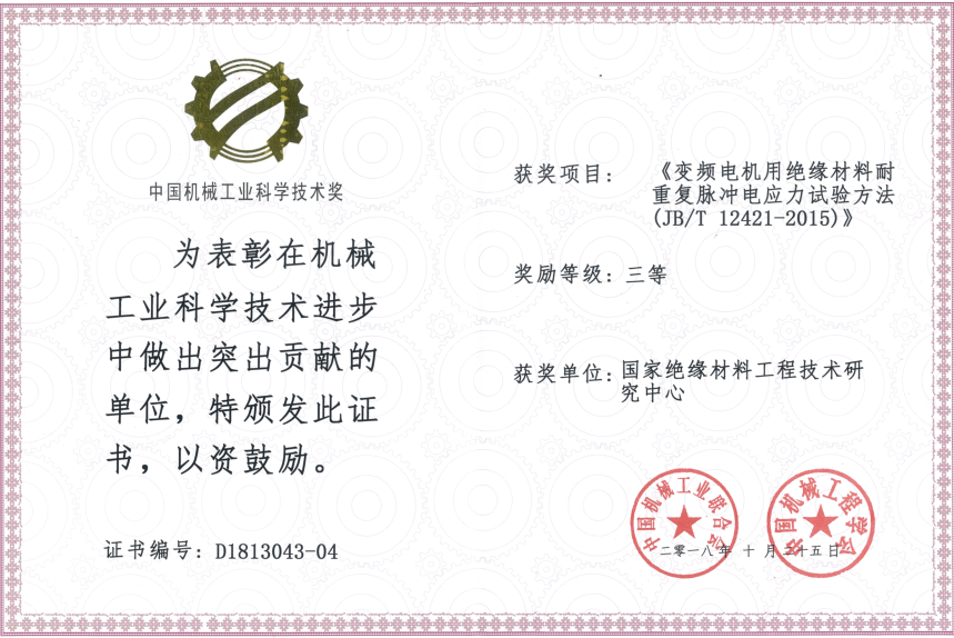 由中國機(jī)械工業(yè)聯(lián)合會和中國機(jī)械工程學(xué)會共同設(shè)立“中國機(jī)械工業(yè)科學(xué)技術(shù)獎”,是中國機(jī)械領(lǐng)域最具權(quán)威的獎項之一。近日,2018年度中國機(jī)械工業(yè)科學(xué)技術(shù)獎獲獎項目公布,我公司(國家絕緣材料工程技術(shù)研究中心)參與制定的行業(yè)標(biāo)準(zhǔn)JB/T12421-2015《變頻電機(jī)用絕緣材料耐重復(fù)脈沖電應(yīng)力試驗方法》榮獲 “中國機(jī)械工業(yè)科學(xué)技術(shù)獎” 三等獎。此次獲獎?wù)f明公司一如既往的發(fā)揮著行業(yè)示范帶頭作用,爭先擁有規(guī)則的話語權(quán),為公司提高核心競爭力和產(chǎn)品創(chuàng)新能力提供了助力。